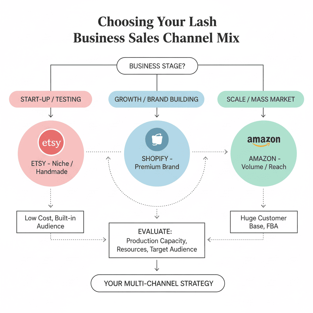 Choose sales channels that match your business stage, with most lash brands eventually using 2-3 platforms for optimal growth and risk management.