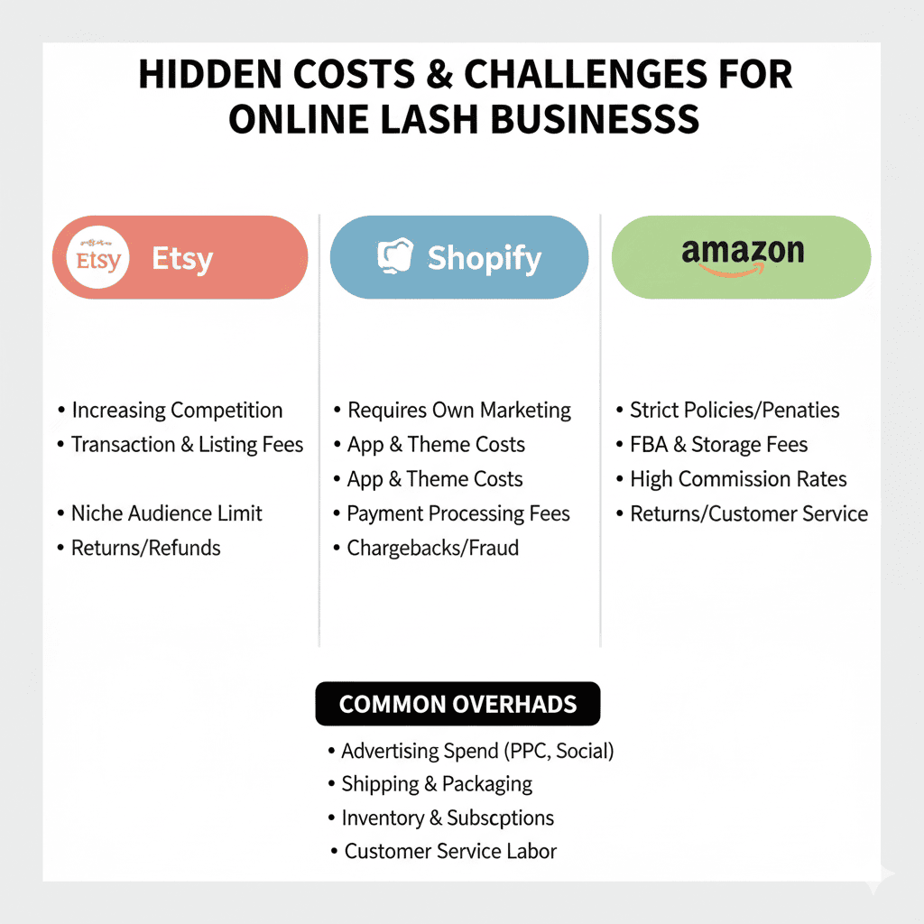 Hidden costs include chargeback fees, return processing, advertising spending, and inventory storage. Platform-specific challenges include Amazon’s strict policies, Etsy’s increasing competition, and Shopify’s need for continuous marketing investment [3][4].