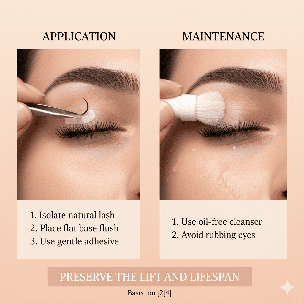 Apply L curl lashes by isolating natural lashes, placing the flat base flush against the lid, and using gentle adhesive; maintain them with oil-free cleansers and avoiding rubbing to preserve the lift [2][4].