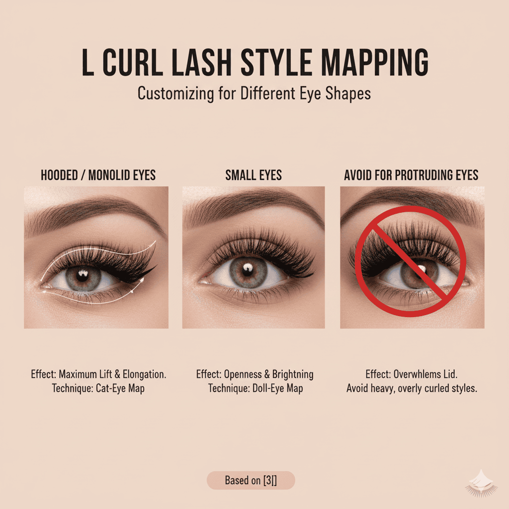 L curl lashes excel on hooded eyes, monolid eyes, and small eyes by providing maximum lift; use cat-eye mapping for elongation or doll-eye for openness, avoiding styles that overwhelm the lid [3][5].