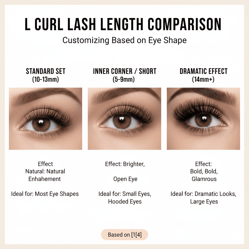 Select L curl lengths based on eye shape: use 10-13mm for standard sets, shorter lengths (5-9mm) for inner corners, and longer lengths (14mm+) for dramatic effects, always considering natural lash strength [1][4].