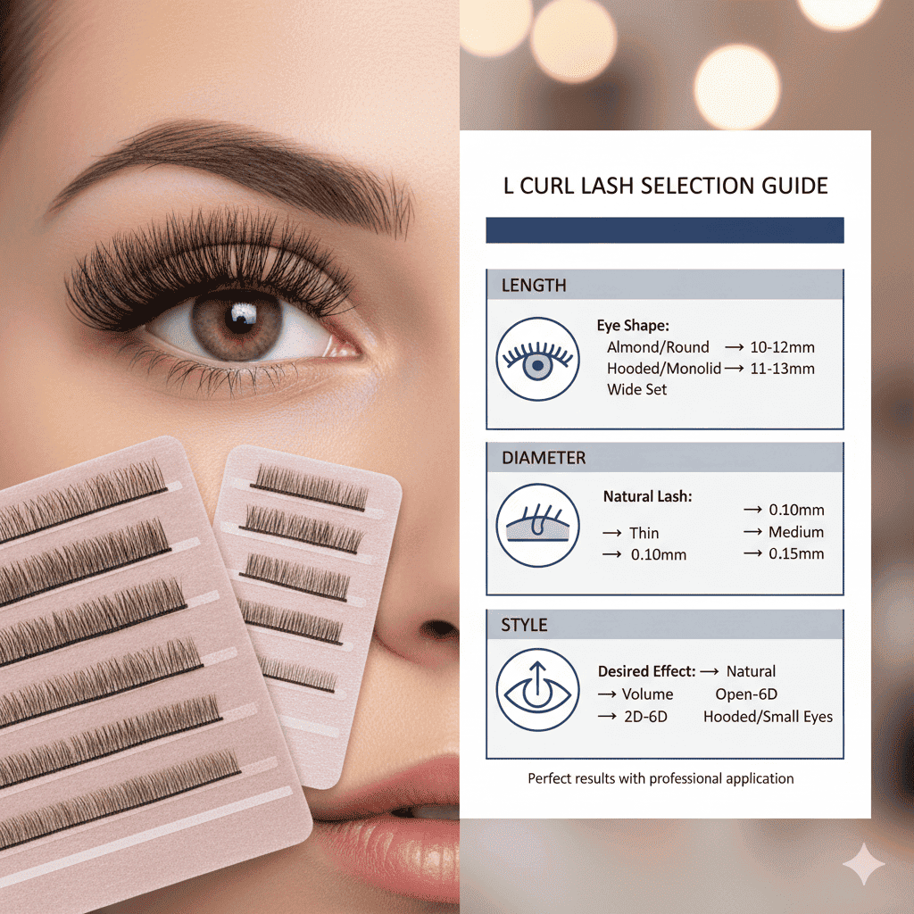 Choose L curl lashes by matching length to eye shape (10-13mm for most), diameter to natural lash thickness (0.10-0.15mm for classics), and style to desired effect (open-eye for hooded lids)[1][4]. This guide provides clear recommendations for perfect results.