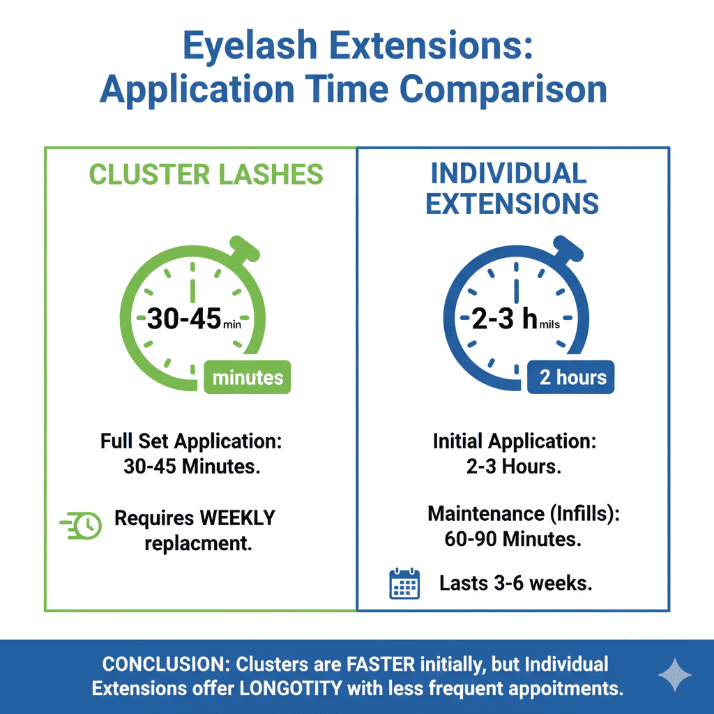 Cluster lash application takes 30-45 minutes for a full set. Individual extensions require 2-3 hours initially but only 60-90 minutes for maintenance. Clusters offer speed, individuals provide longevity with less frequent appointments.
