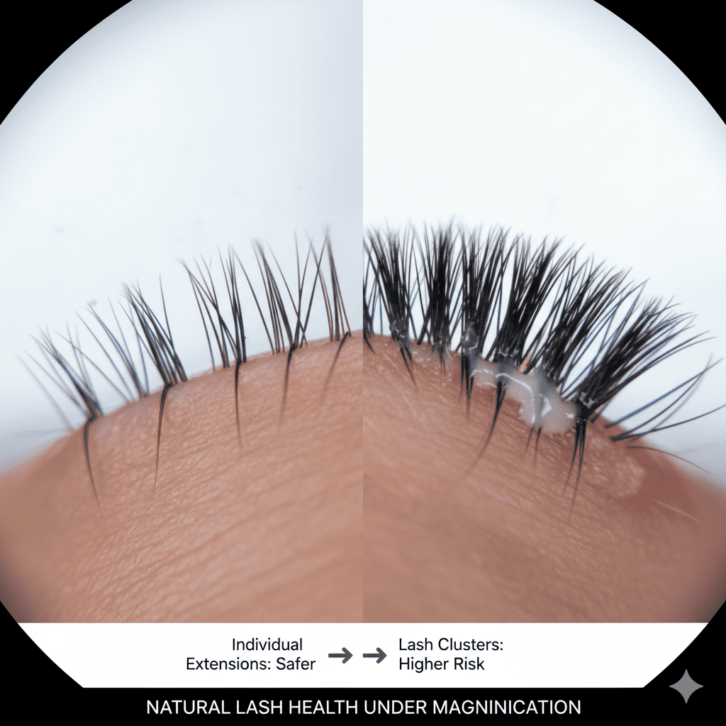 Individual extensions are generally safer when applied correctly because they follow natural lash growth cycles. Clusters can damage natural lashes if too heavy or improperly removed. Proper application by certified technicians minimizes risks for both methods.