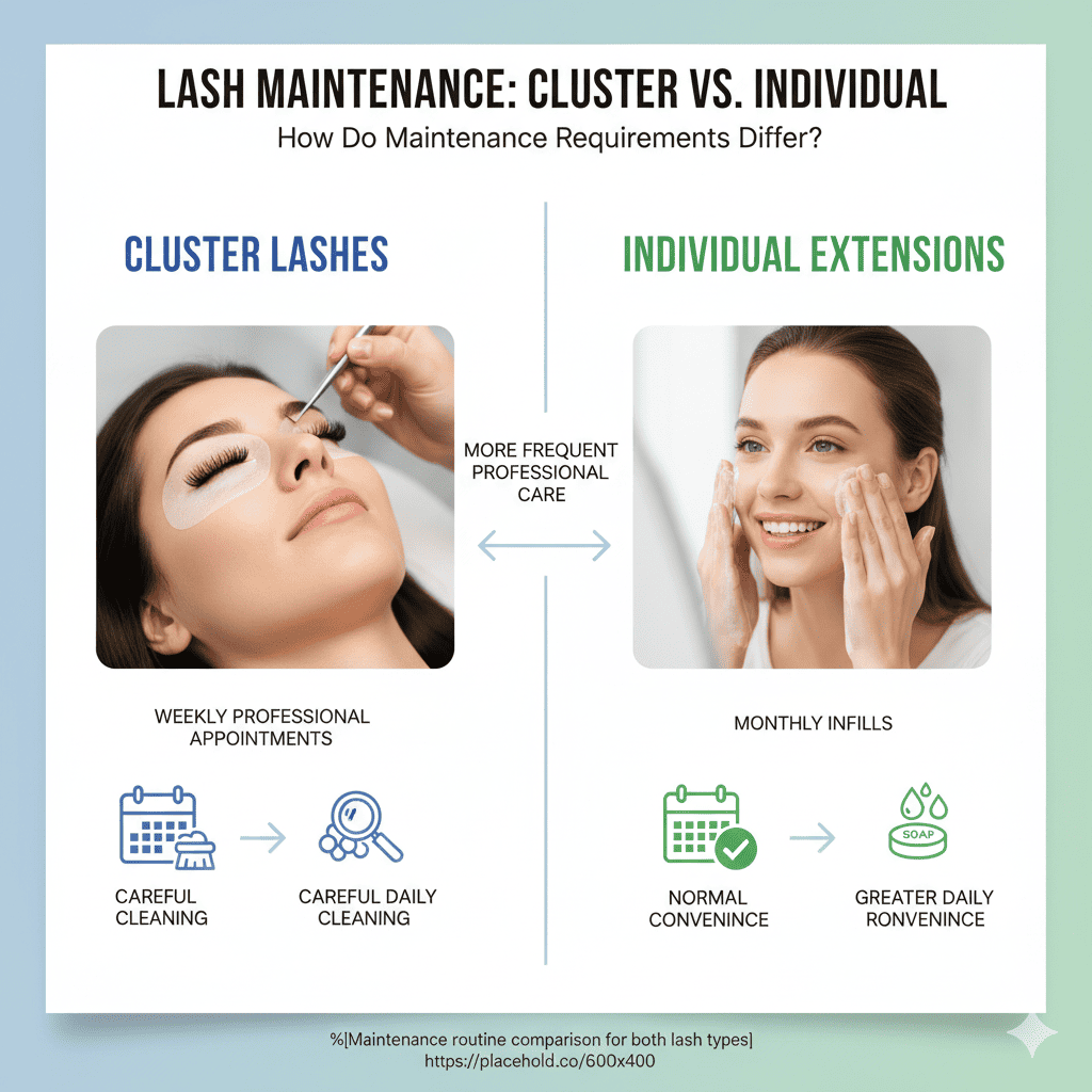 Cluster lashes require weekly maintenance appointments and careful daily cleaning. Individual extensions need monthly infills but allow normal cleansing routines. Clusters demand more frequent professional care, while individuals offer greater daily convenience.
