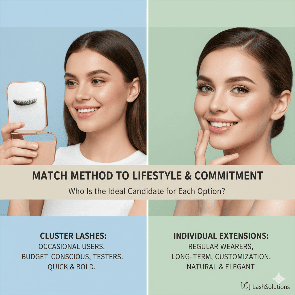 Cluster lashes suit occasional users, budget-conscious clients, and those wanting to test lash enhancements. Individual extensions ideal for regular wearers seeking long-term solutions, customization, and natural-looking results. Match method to lifestyle and commitment level.