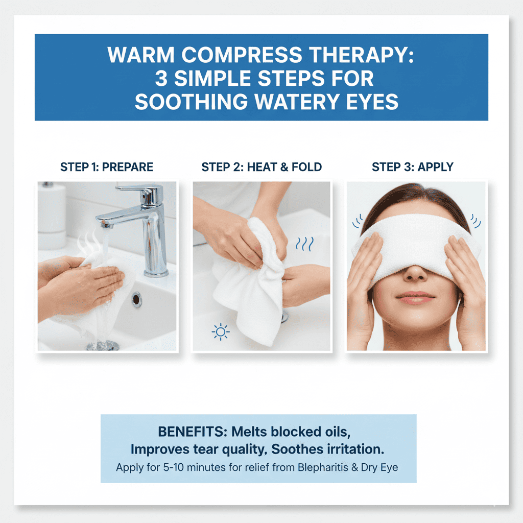 Warm compresses work by melting blocked oils in eyelid glands, improving tear quality, and soothing irritation. Applying a clean, warm cloth for 5-10 minutes can provide immediate relief from watery eyes caused by blepharitis or dry eye.