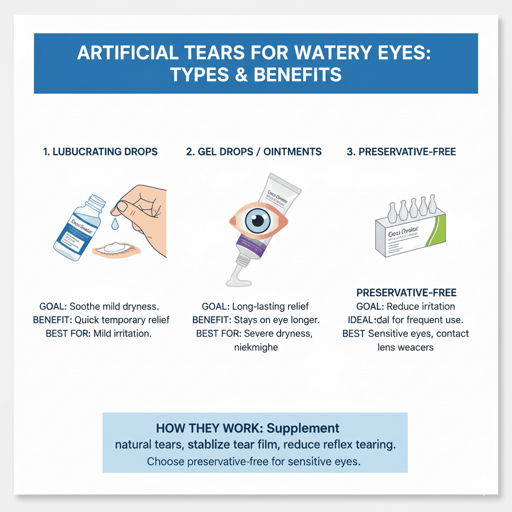Artificial tears might seem counterintuitive for watery eyes, but they play a crucial role in stabilizing the tear film and reducing reflex tearing.