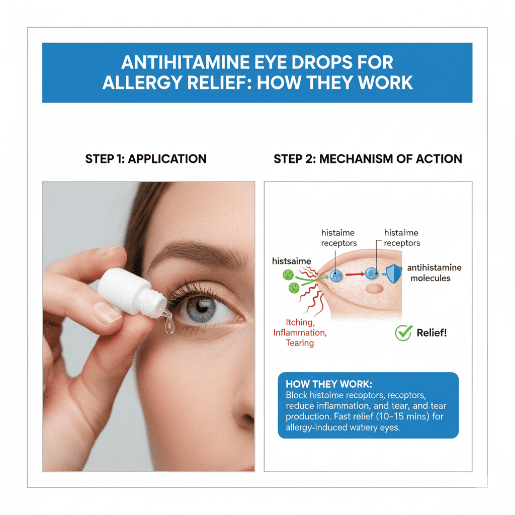 Antihistamine eye drops work by blocking histamine receptors in the eyes, reducing itching, inflammation, and tear production. They provide fast relief within 10-15 minutes for allergy-induced watery eyes.