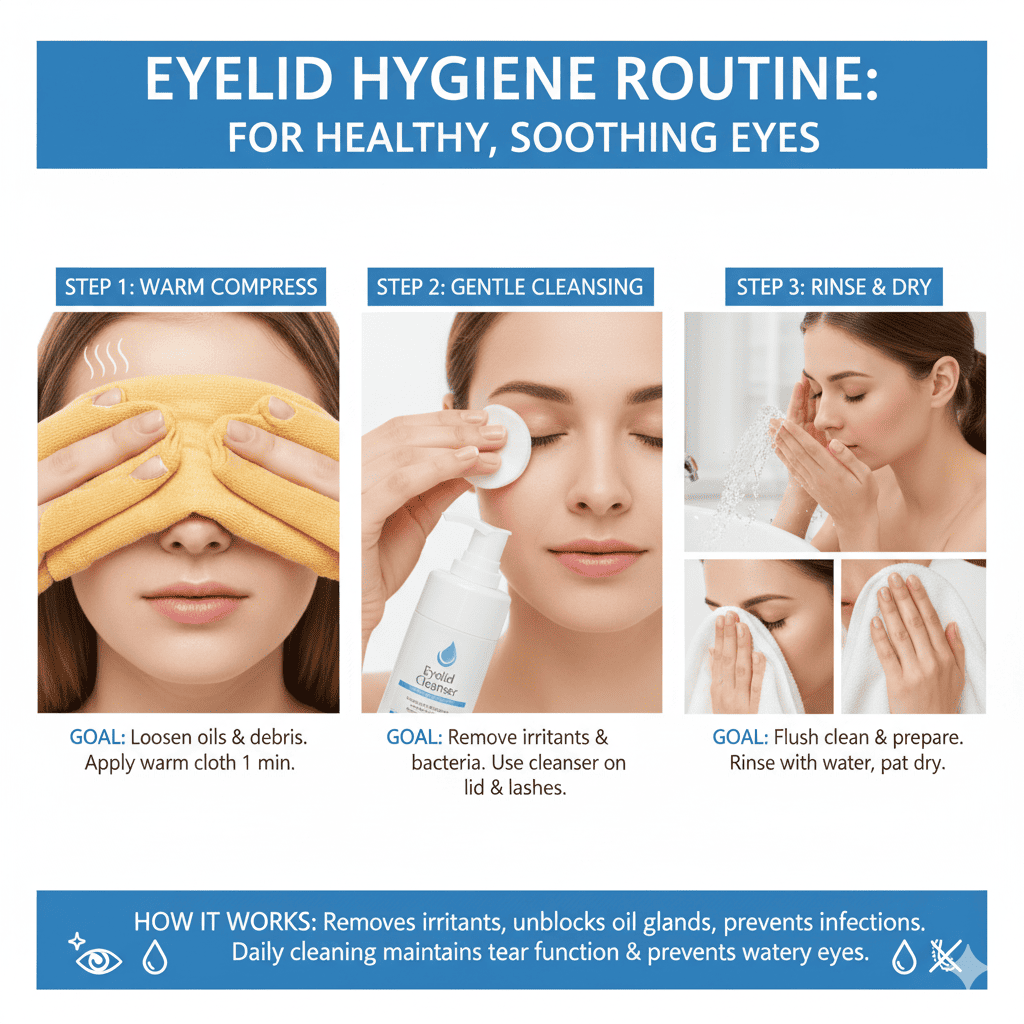 Eyelid hygiene reduces watery eyes by removing irritants, unblocking oil glands, and preventing infections. Daily cleaning with warm water and gentle cleansers maintains eyelid health and proper tear function.