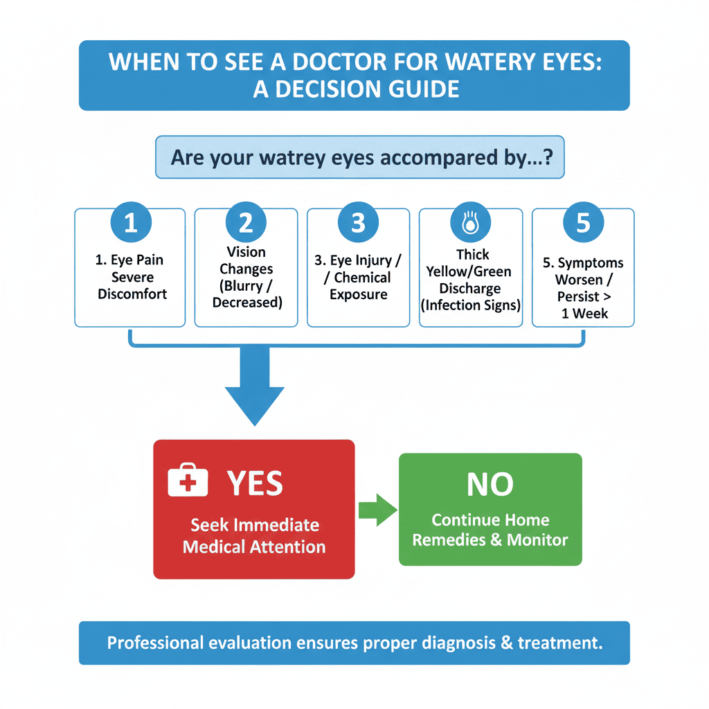 Seek medical help for watery eyes if you experience pain, vision changes, eye injury, persistent symptoms despite treatment, or signs of infection like yellow discharge. Professional evaluation ensures proper diagnosis and treatment.