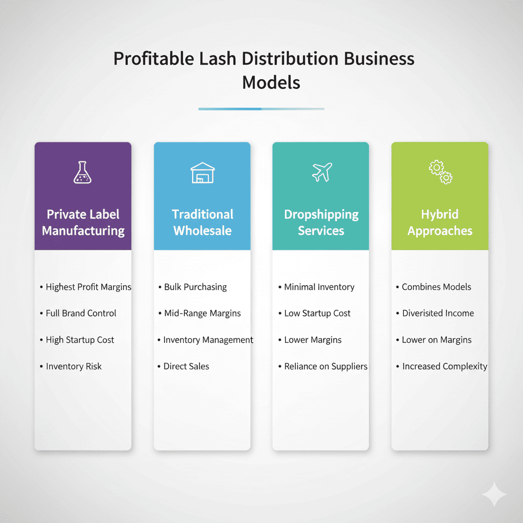 The most profitable lash distribution models include private label manufacturing, traditional wholesale, dropshipping services, and hybrid approaches. Private label offers highest margins while dropshipping requires minimal inventory investment.