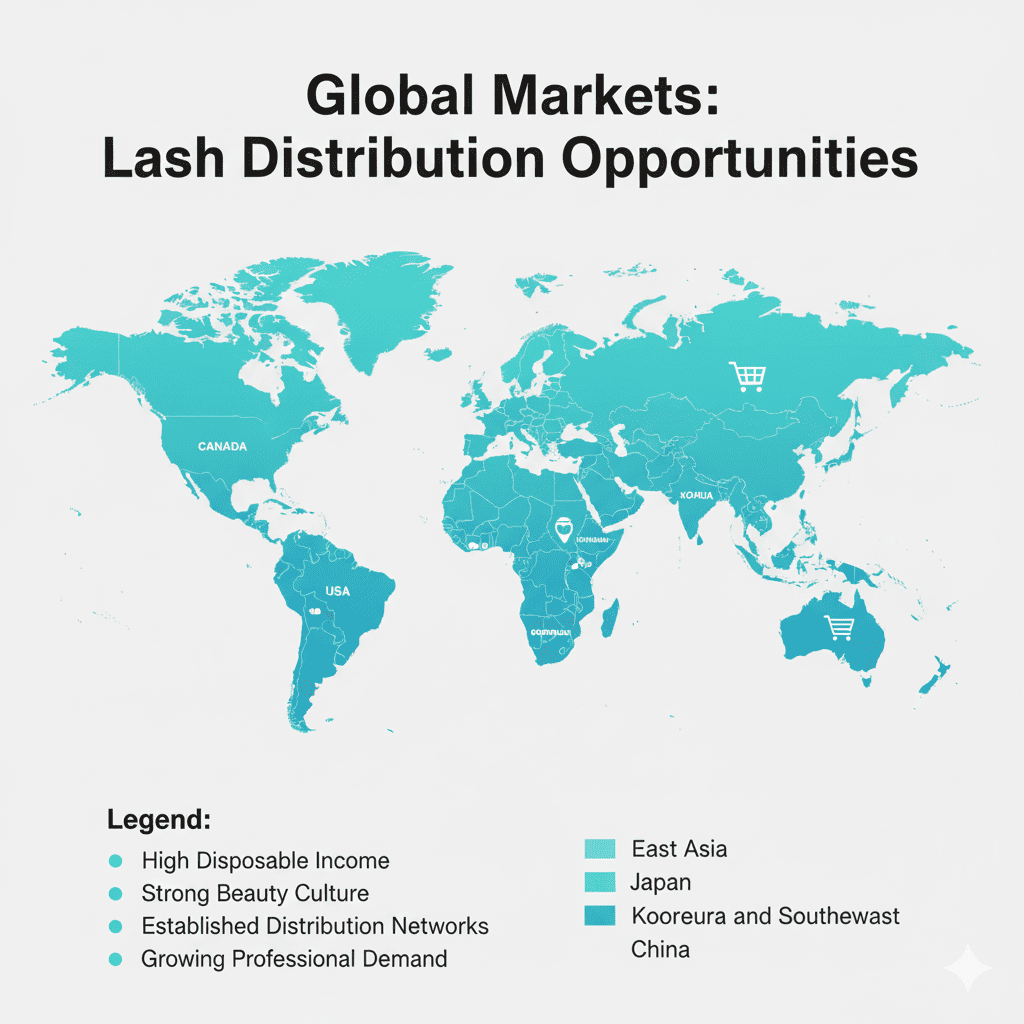 The best markets for lash distribution include North America, Europe, Australia, and emerging Asian markets. Factors favoring these markets include high disposable income, strong beauty culture, established distribution networks, and growing professional lash service demand.