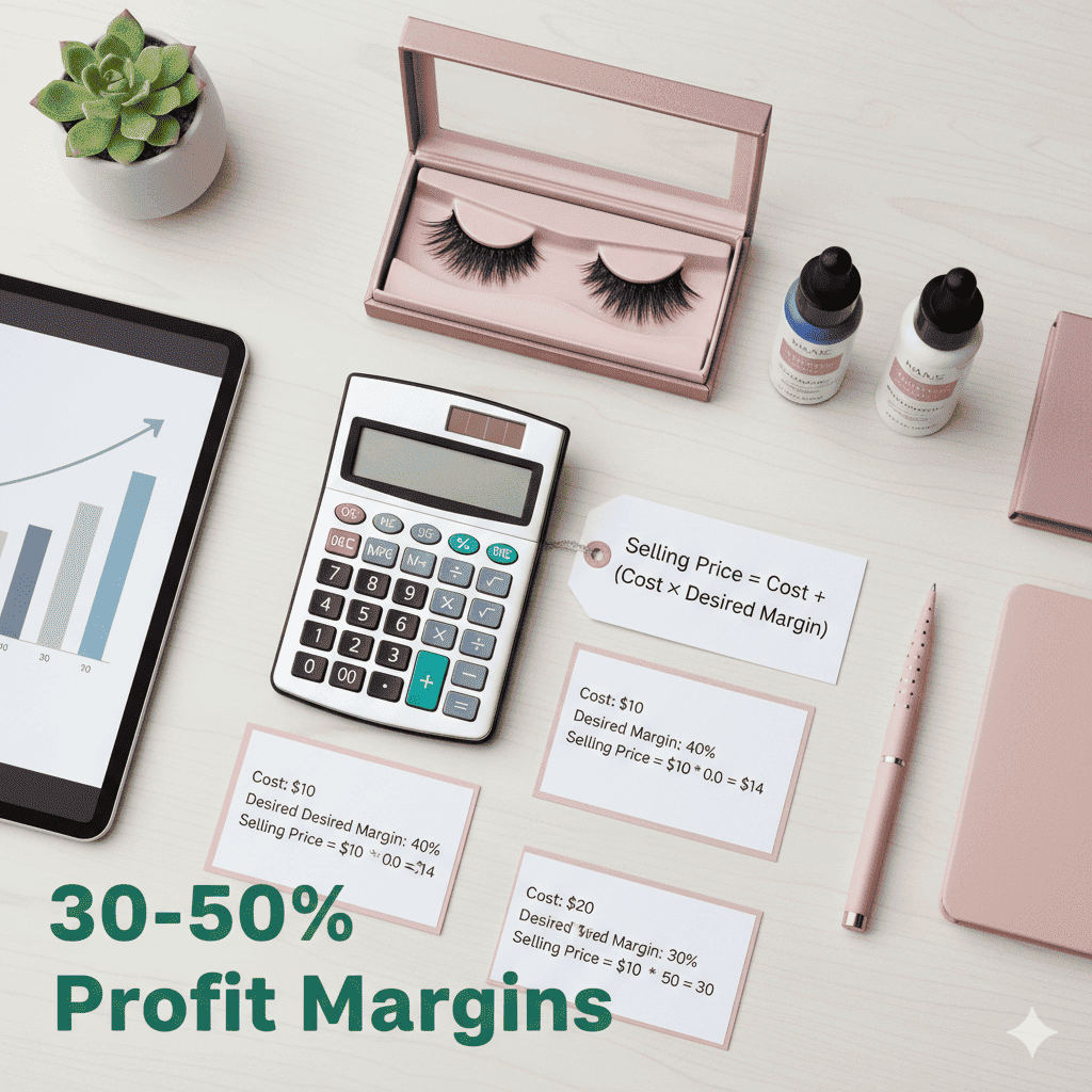 Typical lash product profit margins range from 30-50%, calculated using the formula: Selling Price = Cost + (Cost × Desired Margin). This ensures profitability while remaining competitive [3].