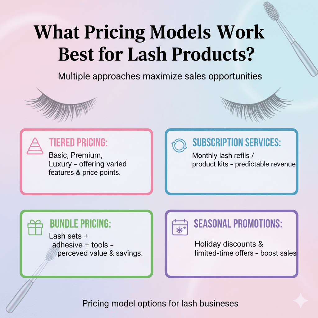 Tiered pricing allows you to serve different customer segments with varying budgets [3]. Offer basic, premium, and luxury tiers with corresponding price points. Subscription models provide customers with regular lash deliveries at discounted rates, creating predictable revenue streams [3]. Product bundles combine multiple items at a better value, increasing your average order value. Seasonal promotions can boost sales during slower periods or capitalize on holiday shopping [3]. Volume discounts encourage customers to purchase larger quantities by offering better per-unit pricing. The most successful lash brands often combine several pricing models to maximize their reach and revenue potential across different customer types.