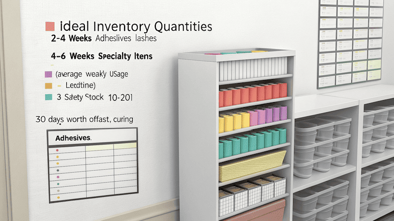Maintain 2-4 weeks of regular-use products (adhesives, lashes) and 4-6 weeks of slower-moving items (specialty curls/lengths). Calculate using: (Average weekly usage × Lead time) + Safety stock (10-20%). Never exceed 30 days’ worth of fast-curing adhesives [1][3].
