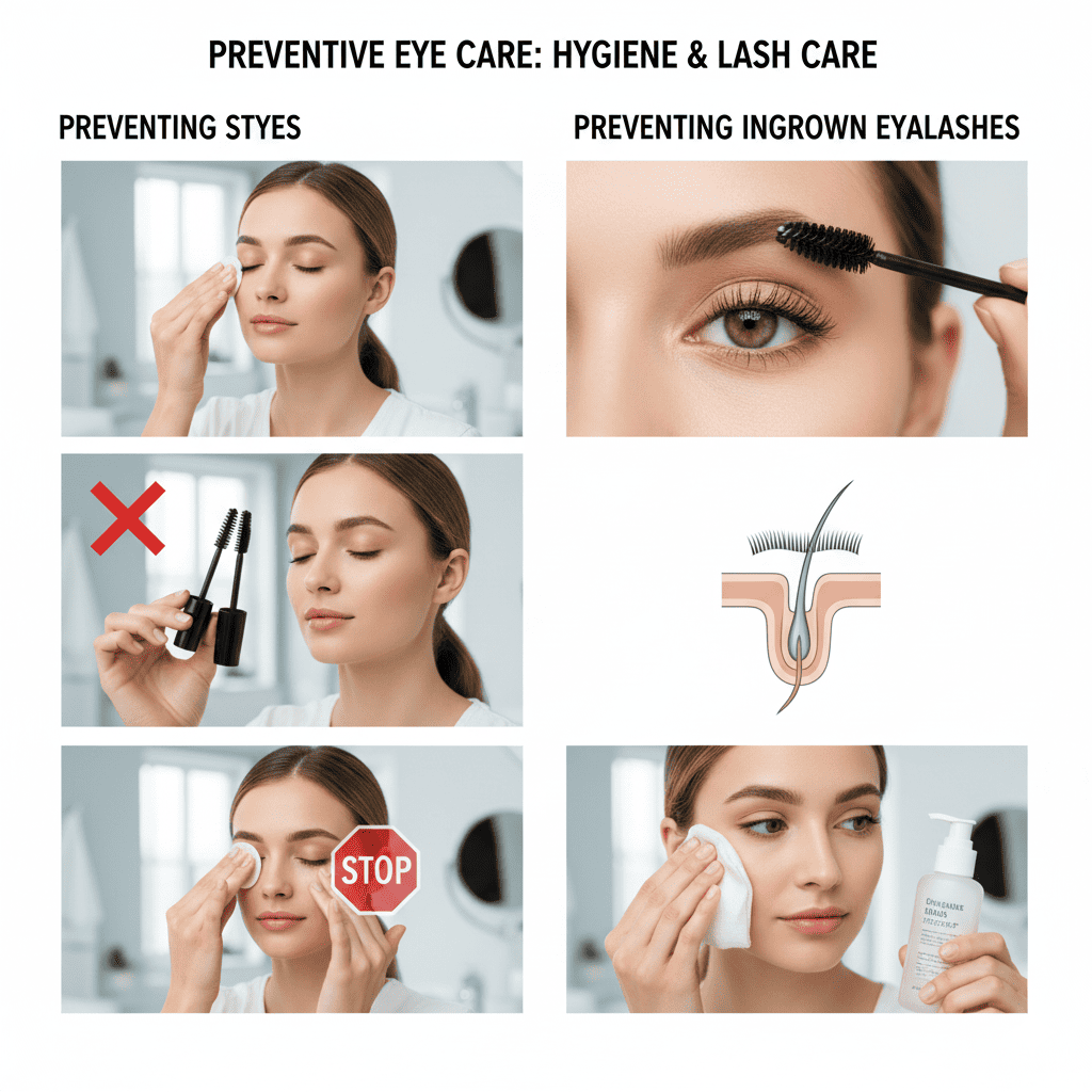 Prevent styes with strict eyelid hygiene, avoiding eye rubbing, and replacing eye makeup regularly. Prevent ingrown eyelashes by proper lash care, avoiding trauma, and managing underlying eyelid conditions.